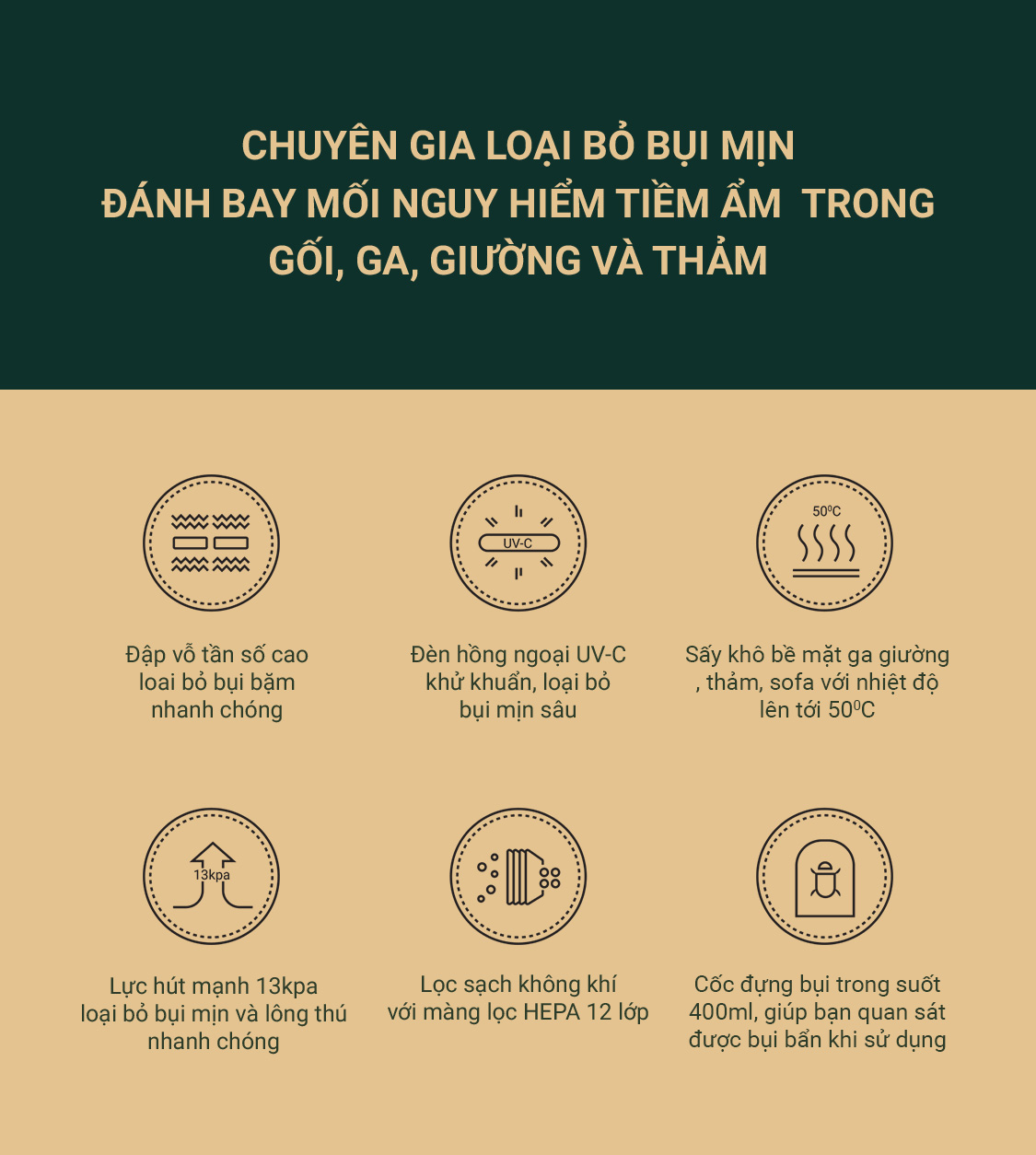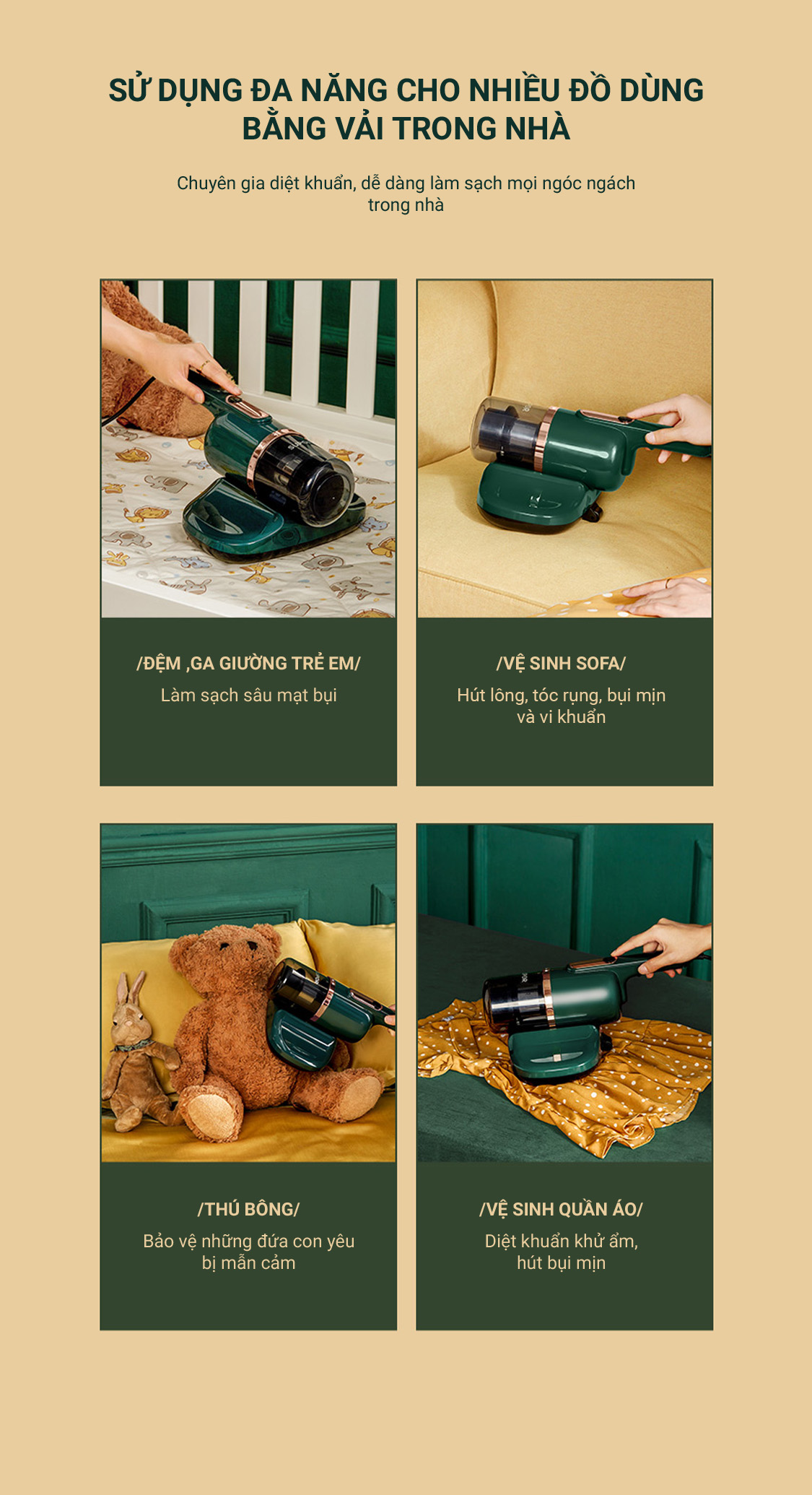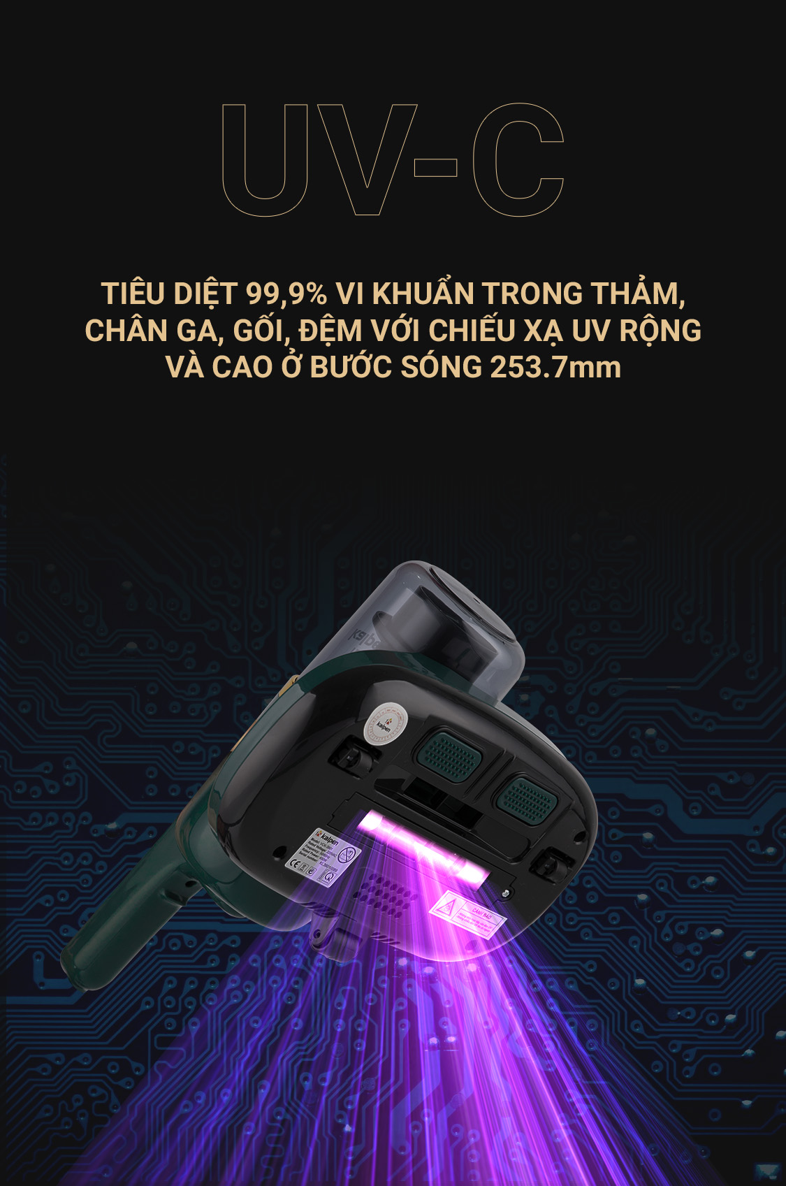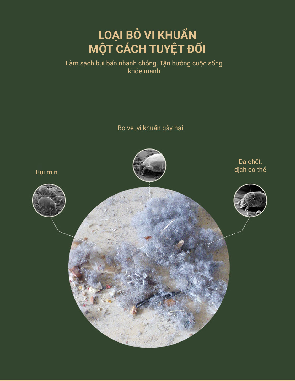 -Làm sạch sâu, loại bỏ nhanh chóng 99.9 % vi khuẩn, bọ ve, bụi mịn tồn tại trong chăn gối lâu ngày. Ngăn chặn các bệnh về đường hô hấp, di ứng, mụn nhọt trên da bằng chiếu xạ UV rộng và cao ở mức sóng 253.7mm.