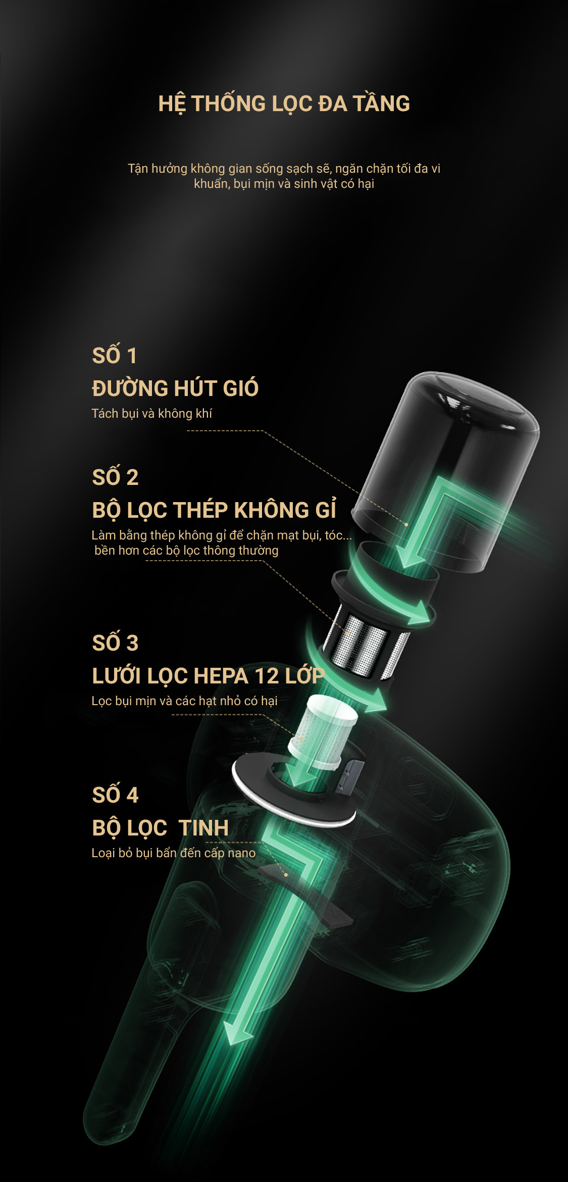 -Bộ lọc đa tầng, đảm bảo bụi bẩn, không khí thải ra cũng phải sạch nhất. Máy sở hữu màng lọc Inox kết hợp với tấm lọc bụi mịn HEPA 12 lớp giúp lọc hoàn toàn bụi, vi khuẩn mang đến không gian sạch cho gia đình bạn.