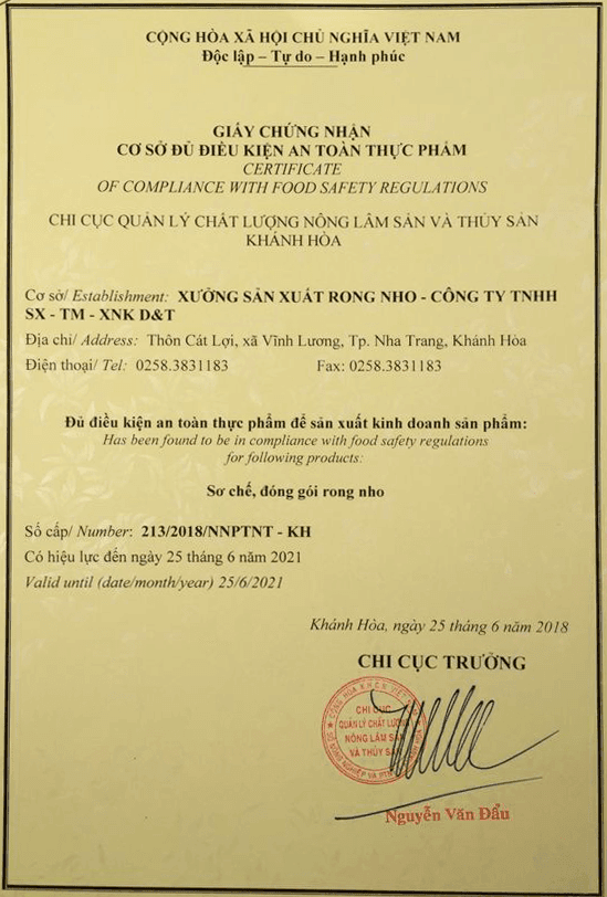 Hiện rong nho Sabudo được chứng nhận về độ an toàn cao, được Bộ y tế cấp phép và cho phép sử dụng trên toàn quốc.