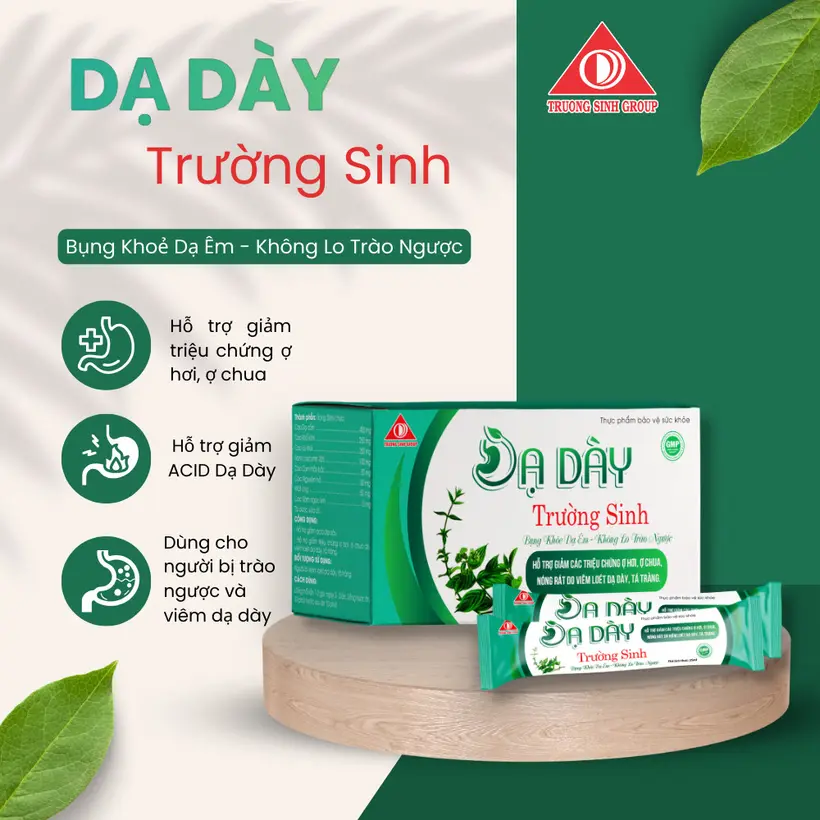 Dạ Dày Trường Sinh là sản phẩm hỗ trợ tiêu hóa được bào chế dưới dạng cốm pha, giúp hỗ trợ cải thiện tình trạng dư acid dạ dày, hỗ trợ giảm các triệu chứng như ợ hơi, ợ nóng, ợ chua và đầy bụng khó tiêu.