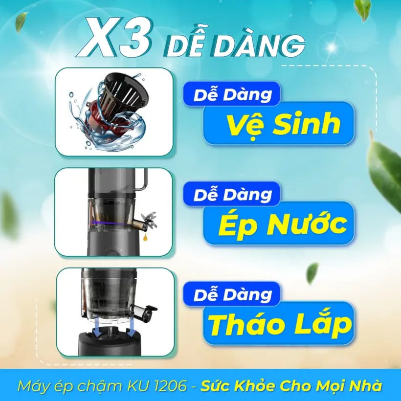 Máy ép chậm KUCHEN KU 1206 ép kiệt bã, giữ trọn vitamin, vận hành êm ái, thiết kế sang trọng, dễ vệ sinh. Lựa chọn hoàn hảo cho gia đình hiện đại.