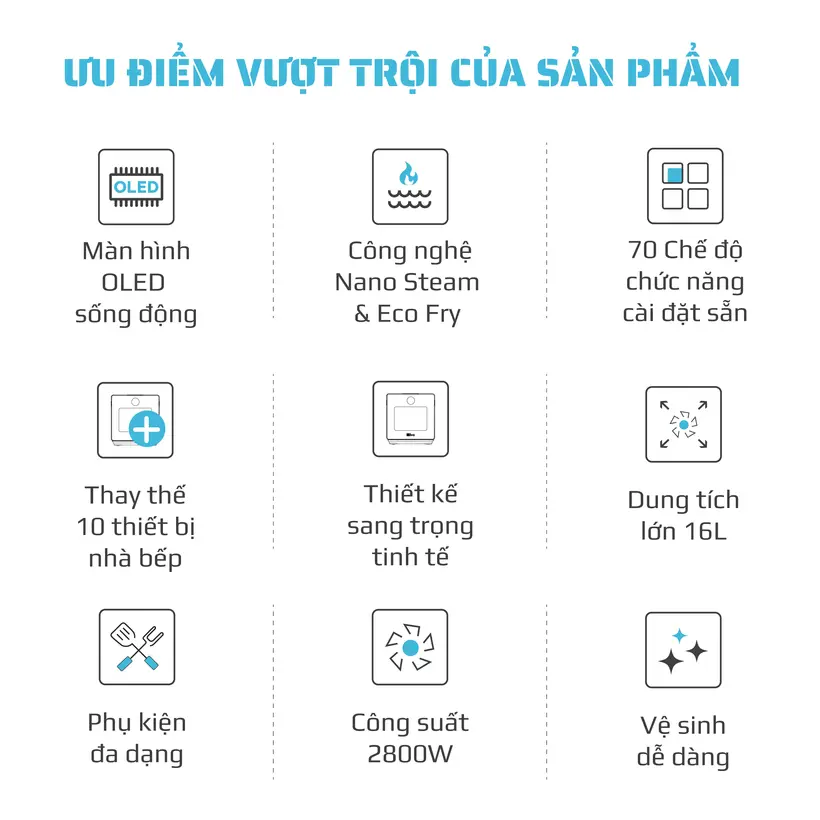 - 1 nồi = 7 thiết bị: hấp, chiên, nướng, sấy, quay, hâm nóng…
